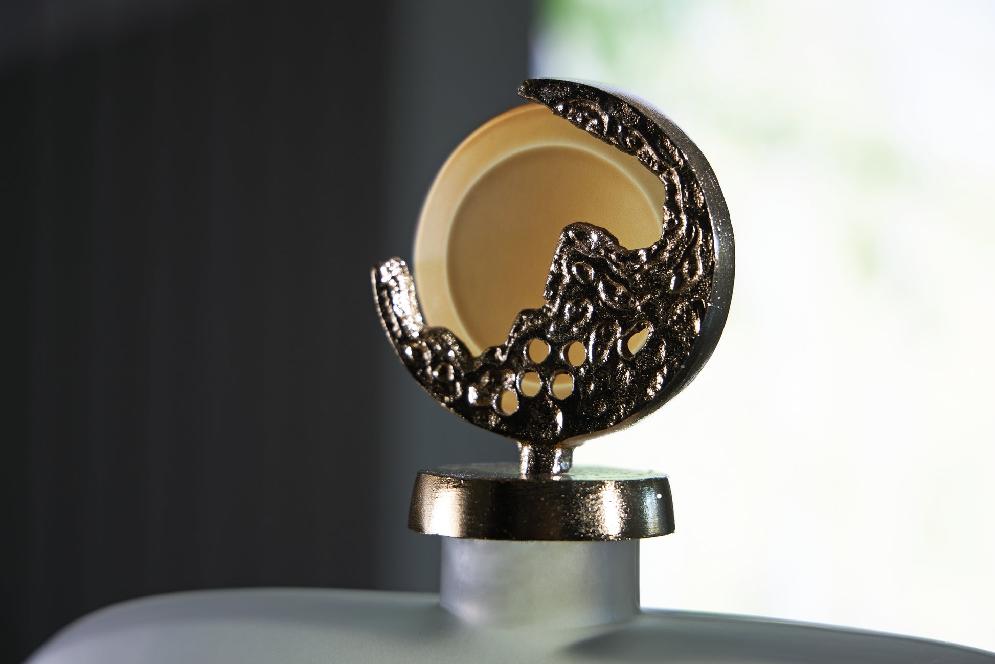 Bring stately elegance home with this jar. Made with frosted glass in a luxurious taupe finish, its ombre effect adds visual intrigue to a shelf or mantle. A textured goldtone topper provides an added dose of traditional flair.