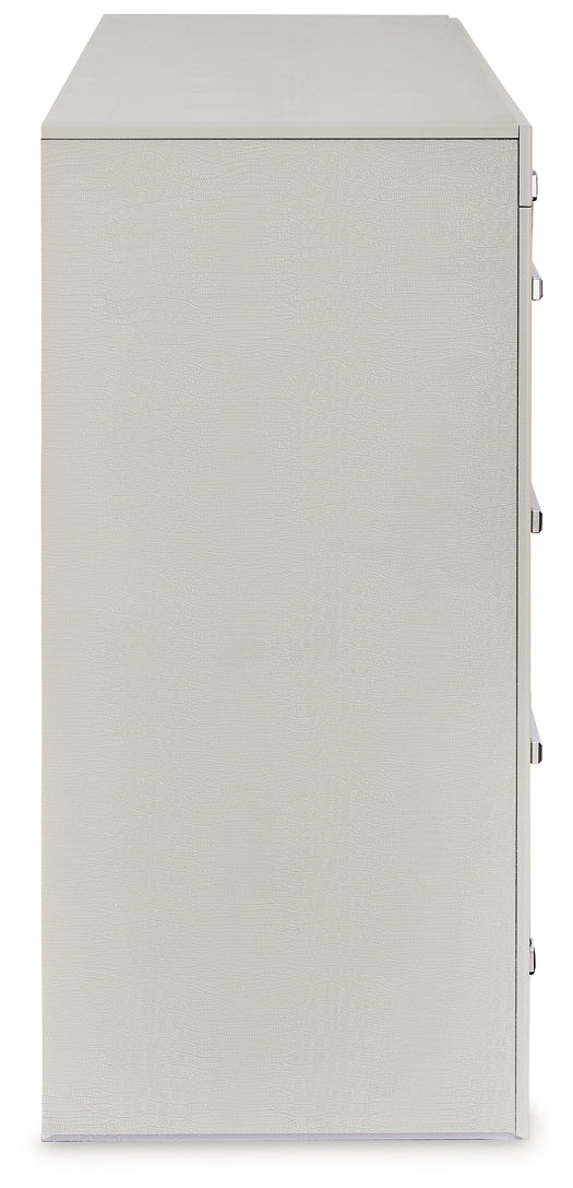 Bright, bold luxury. This dresser dazzles with its attention to detail. Your love of glamorous style is reflected in its all-over faux gator pattern in a metallic finish, exquisitely paired with faceted chrome-tone details. Complete with smooth-gliding storage drawers, it inspires you to live luxuriously every day—whether dressing up to go out or dressing down to stay in.